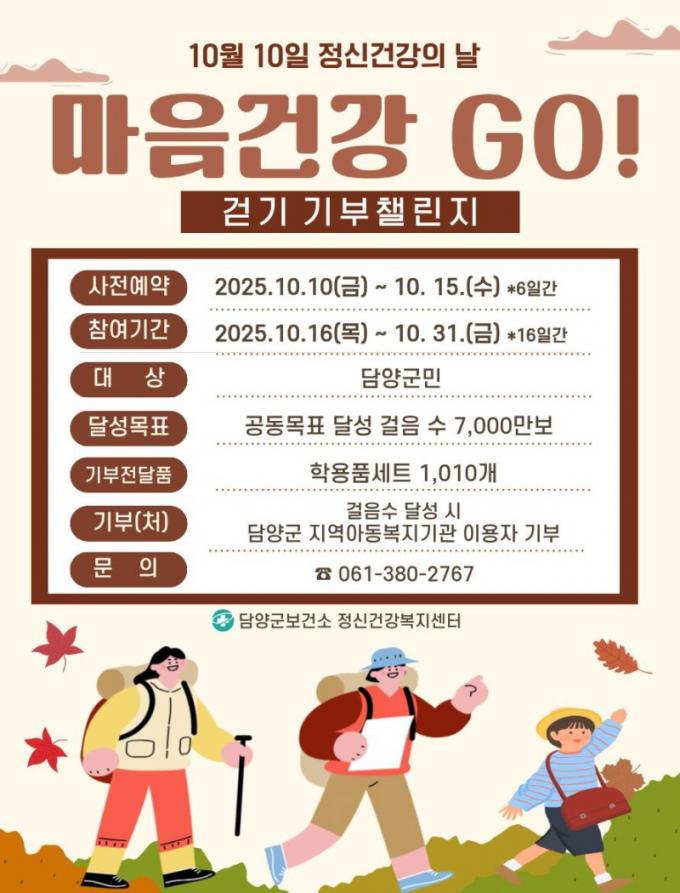 ¡®¸¶À½°Ç° °í(GO)! °È±â ±âºÎ縰Áö¡¯´Â ±º¹ÎÀÌ Àϻ󿡼 °È±â¸¦ ½ÇõÇϸç Á¤½Å°Ç° ÁõÁø°ú ³ª´®À» µ¿½Ã¿¡ ½ÇÇöÇÏ´Â Çà»ç´Ù. 10¿ù 16ÀϺÎÅÍ 31ÀϱîÁö 16Àϰ£ 7õ¸¸ º¸ÀÇ °øµ¿°ÉÀ½À» ¸ñÇ¥·Î ÁøÇàÇÑ´Ù.