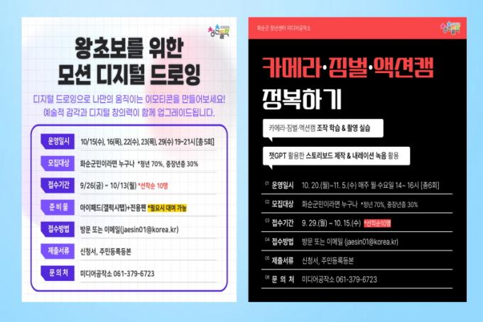 2°³ ±³À° ¸ðµÎ ȼø±º¹ÎÀÌ¸é ´©±¸³ª ½ÅûÀÌ °¡´ÉÇϸç, ¸ðÁý ÀοøÀÇ 70%´Â û³âÀ» ¿ì¼± ¼±¹ßÇÏ°í ³ª¸ÓÁö 30%´Â ÁßÀå³âÃþÀ» ¼±¹ßÇÒ ¿¹Á¤ÀÌ´Ù. ½ÅûÀ» À§Çؼ´Â ½Åû¼¿Í Áֹεî·Ïµîº»À» Á¦ÃâÇØ¾ß ÇÏ¸ç ¡âµðÁöÅеå·ÎÀ× ±³À°Àº 10¿ù 13ÀϱîÁö, ¡âÄ«¸Þ¶ó¡¤Áü¹ú¡¤¾×¼ÇÄ· Á¤º¹Çϱ⠱³À°Àº 10¿ù 15ÀϱîÁö û³â¼¾ÅÍ ¹æ¹® ¶Ç´Â °ø½Ä ȨÆäÀÌÁö(https://www.hwasun.go.kr/youth)¸¦ ÅëÇØ ½ÅûÀÌ °¡´ÉÇÏ´Ù.