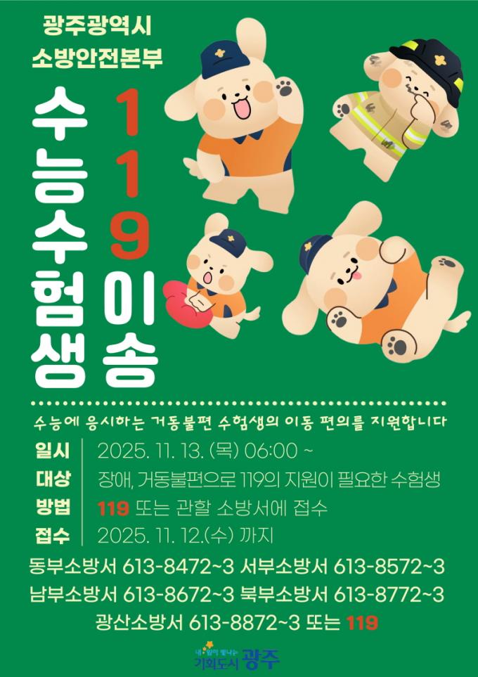 [µ¥Àϸ®Àü³² = ÃÖ¼ö¿¬ ±âÀÚ] ±¤ÁÖ±¤¿ª½Ã ¼Ò¹æ¾ÈÀüº»ºÎ´Â ´ëÇмöÇдɷ½ÃÇèÀÏÀÎ 11¿ù13ÀÏ °Åµ¿ÀÌ ºÒÆíÇÑ ¼öÇè»ýµéÀÇ À̵¿ ÆíÀǸ¦ À§ÇØ ¡®119 À̼ÛÁö¿ø ¼ºñ½º¡¯¸¦ Á¦°øÇÑ´Ù.