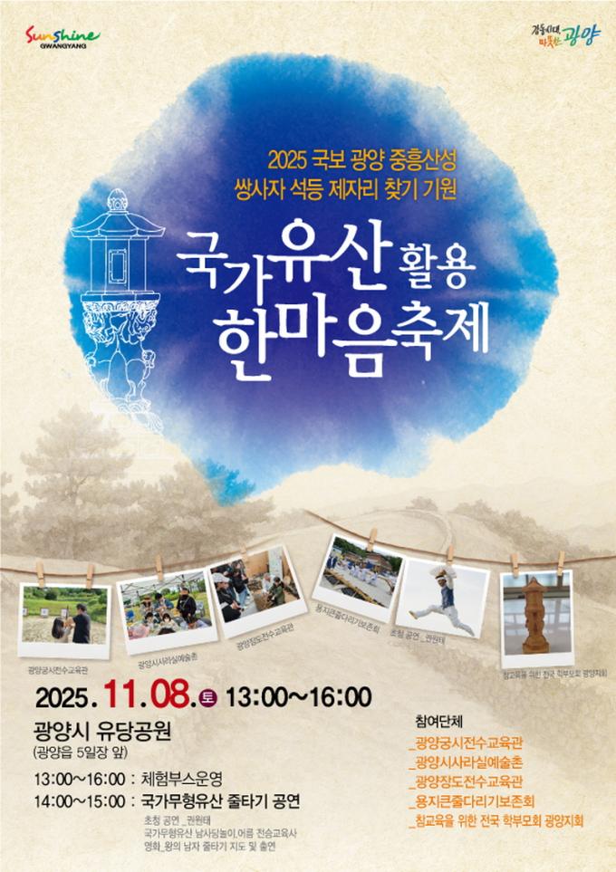 À̹ø Çà»ç¿¡´Â ±¤¾çÀÇ ±¹°¡À¯»êÀ» ³Î¸® ¾Ë¸®±â À§ÇØ Èû½á¿Â ¡ã±¤¾çÀåµµÀü¼ö±³À°°ü ¡ã±¤¾ç±Ã½ÃÀü¼ö±³À°°ü ¡ã¿ëÁöÅ«Áٴٸ®±âº¸Á¸È¸ ¡ã±¤¾ç½Ã»ç¶ó½Ç¿¹¼úÃÌ ¡ãÂü±³À°À» À§ÇÑ Àü±¹Çкθðȸ ±¤¾çÁöȸ 5°³ ´Üü°¡ Âü¿©ÇÑ´Ù.