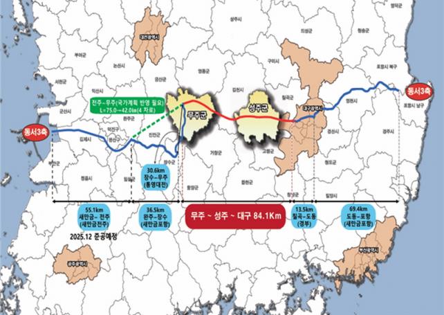 ¡®¹«ÁÖ~¼ºÁÖ~´ë±¸ °í¼Óµµ·Î °Ç¼³»ç¾÷¡¯ ±¸°£Àº ÀüºÏ ¹«ÁÖ±º¿¡¼ °æºÏ ¼ºÁÖ±ºÀ» °ÅÃÄ ´ë±¸±¤¿ª½Ã·Î À̾îÁö´Â ¿Õº¹ 4Â÷·Î·Î ÃÑ¿¬Àå 84.1kmÀÌ´Ù. °í¼Óµµ·Î¿Í ÀϹݵµ·Î(±¹µµ, Áö¹æµµ)°¡ ¸¸³ª´Â ³ªµé¸ñ 7°÷, °í¼Óµµ·Î¿Í °í¼Óµµ·Î¸¦ ¿¬°áÇÏ´Â ºÐ±âÁ¡ 3°÷À» Æ÷ÇÔÇϸç ÃÑ»ç¾÷ºñ´Â ¾à 6Á¶ 4õ¾ï ¿ø ±Ô¸ð´Ù.