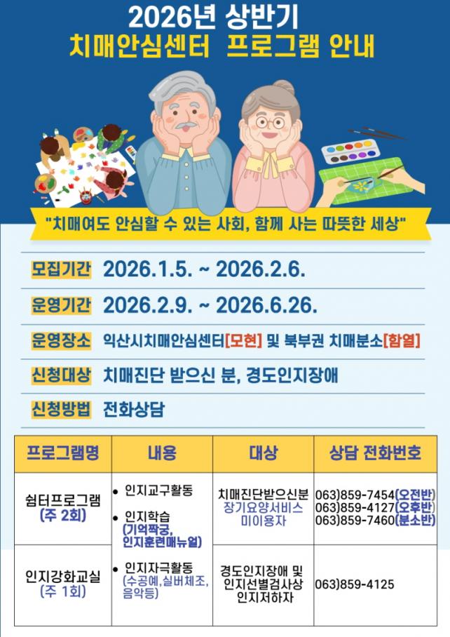 [µ¥Àϸ®Àü³² = ±è¼ºÇö ±âÀÚ] ÀÍ»ê½Ã´Â Ä¡¸Å¾È½É¼¾ÅÍ¿¡¼ °æµµÀÎÁöÀå¾Ö ¹× Ä¡¸ÅȯÀÚ¸¦ ´ë»óÀ¸·Î ¿î¿µÇÏ´Â ÀÎÁöÈÆ·ÃÇÁ·Î±×·¥ '±â¾ïÀÇ º½ Çб³' Âü¿©ÀÚ¸¦ ¸ðÁýÇÑ´Ù°í 12ÀÏ ¹àÇû´Ù.