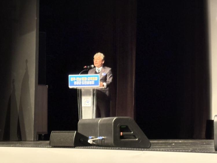 ¹«´ë À§ ´Ü»ó¿¡¼ Àå¼¼ÀÏ ¿µ±¤±º¼ö°¡ ¸¶ÀÌÅ©¸¦ Àâ°í ¡®±¤ÁÖ¡¤Àü³² ÇàÁ¤¡¤±³À°ÅëÇÕ ¿µ±¤±º µµ¹Î°øÃ»È¸¡¯ ÇöÀå¿¡¼ ÅëÇÕ ³íÀÇÀÇ ¹æÇâ°ú Áö¿ª ´ëÀÀ Àü·«À» ¼³¸íÇϰí ÀÖ´Ù. /»çÁø:Á¤Ã¶¿ø ±âÀÚ