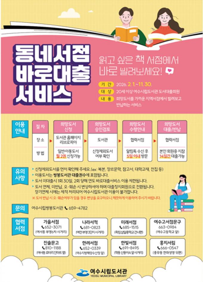 À̹ø ¼ºñ½º¿¡ Âü¿©ÇÏ´Â Çù·Â ¼Á¡Àº °¡À»¼Á¡(¿©¼µ¿), ³ª¶ó¼Àû(½Å±âµ¿), ¹Ì·¡¼Á¡(Á׸²), ¿©¼ö°í¼Á¡¹®±¸(°øÈµ¿), Áø¼Ö¹®°í(¿©¼µ¿), ÇÑ·Á¼Á¡(¿©¼µ¿), ÇѺû¼Á¡(Çе¿), È«Áö¼¸²(Ãæ¹«µ¿) µî ÃÑ 8°³¼Ò´Ù. ´Ù¸¸, ½Åû ÈÄ µµ¼¸¦ ¼ö·ÉÇÏÁö ¾ÊÀ» °æ¿ì 1ȸ´Â 30Àϰ£, 2ȸ ÀÌ»óÀÏ °æ¿ì ÇØ´ç ¿¬µµ ¼ºñ½º ÀÌ¿ëÀÌ Á¦ÇÑµÇ¸ç ´ëÃâÇÑ µµ¼¸¦ ¿À¡¤ÈÑ¼Õ ½Ã¿¡´Â º¯»óÇØ¾ß ÇÑ´Ù.