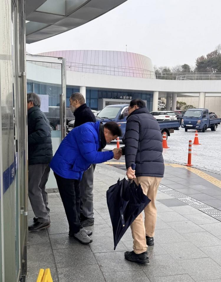 Á¤¿ëÈ£ ¿µ±¤±ºÀÇ¿ø ¿¹ºñÈ帰¡ ºñ¸¦ ¸ÂÀ¸¸ç ±³À°Àå¿¡ µµÂøÇÑ ³ó¾÷Àεé°ú ÀÏÀÏÀÌ Àλ縦 ³ª´©°í ÀÖ´Ù.