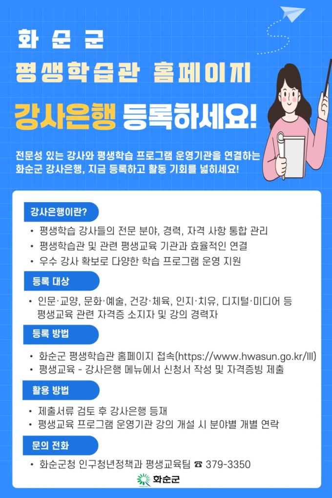 µî·ÏÀ» Èñ¸ÁÇÏ´Â °æ¿ì ȼø±º Æò»ýÇнÀ°ü ȨÆäÀÌÁö(https://www.hwasun.go.kr/lll)¿¡¼ ¡®Æò»ý±³À° °»çÀºÇà µî·Ï ¸Þ´º¡¯¸¦ ÅëÇØ ½Åû¼¿Í ÀÚ°Ý Áõºù ¼·ù¸¦ Á¦ÃâÇÏ¸é µÈ´Ù.