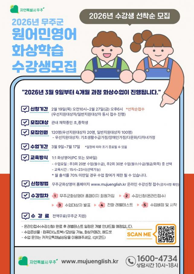 »ç¾÷ ½ÅûÀº ¡®¹«ÁÖ±º È»ó¿µ¾î ´©¸®Áý(www.mujuenglish.kr)À» ÅëÇØ ¿Â¶óÀÎ Á¢¼öÇϸç, ¼±Á¤µÈ ÇлýÀº ¿À´Â 3¿ùºÎÅÍ 7¿ù±îÁö 4°³¿ù°£ ÁÖ 2~3ȸ, ȸ´ç 20~30ºÐÀÇ ¸ÂÃãÇü 1:1 ¿ø¾î¹Î È»ó¿µ¾î ¼ö¾÷À» ÄÄÇ»ÅÍ ¶Ç´Â ¸ð¹ÙÀÏ·Î ¼ö°ÇÒ ¼ö ÀÖ´Ù.