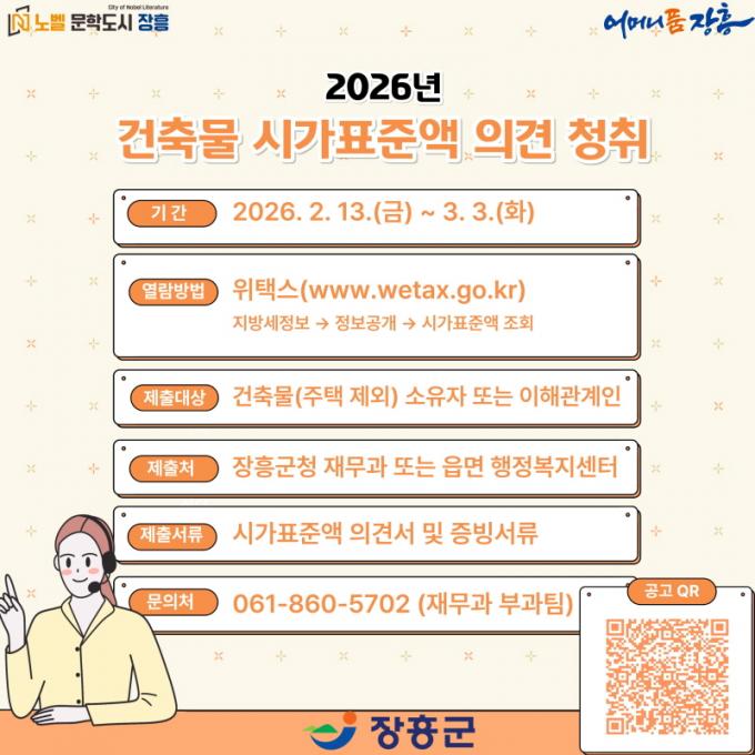 [µ¥Àϸ®Àü³² = ÃÖ¼ö¿¬ ±âÀÚ] ÀåÈﱺÀº 2026³âµµ °ÇÃ๰ ½Ã°¡Ç¥ÁØ¾× °áÁ¤¡¤°í½Ã¿¡ ¾Õ¼ »ó°¡, ¿ÀÇǽºÅÚ µî ºñÁÖ°Å¿ë °ÇÃ๰ÀÇ 2026³â 1¿ù 1ÀÏ ±âÁØ ½Ã°¡Ç¥Áؾ×À» °ø°³Çϰí, ¿À´Â 3¿ù 3ÀϱîÁö ¼ÒÀ¯ÀÚ ¹× ÀÌÇØ°ü°èÀÎÀÇ ÀǰßÀ» Á¢¼öÇÑ´Ù°í ¹àÇû´Ù.