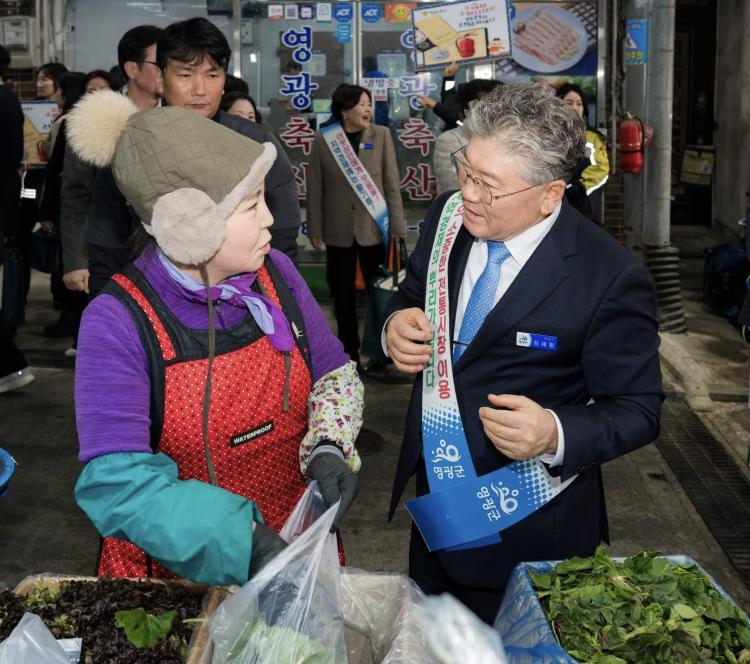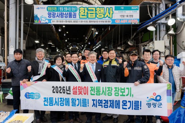 ¼³ ¸íÀýÀ» ¾ÕµÎ°í Àå¼¼ÀÏ ¿µ±¤±º¼ö¸¦ ºñ·ÔÇÑ °ü°èÀÚµéÀÌ ÀüÅë½ÃÀå ÀÔ±¸¿¡¼ ¡®2026³â ¼³¸ÂÀÌ ÀüÅë½ÃÀå À庸±â, ÀüÅë½ÃÀå¿¡ Ȱ±â¸¦! Áö¿ª°æÁ¦¿¡ ¿Â±â¸¦!¡¯ Çö¼ö¸·À» µé°í ±â³äÃÔ¿µÀ» Çϰí ÀÖ´Ù. »ó´Ü¿¡´Â ¡®¿µ±¤»ç¶û»óǰ±Ç ȯ±ÞÇà»ç¡¯ ¾È³» Çö¼ö¸·ÀÌ °É·Á ÀÖ¾î ¸íÀý ¼Òºñ ÃËÁø Çà»ç ºÐÀ§±â¸¦ ÀüÇϰí ÀÖ´Ù. /»çÁø:¿µ±¤±º Á¦°ø