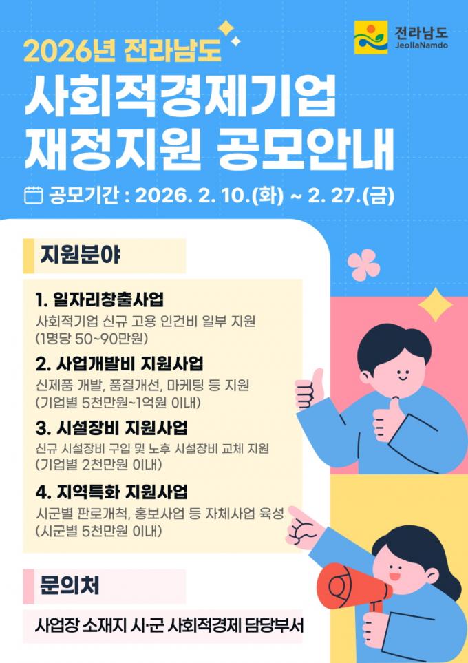 [µ¥Àϸ®Àü³² = ÃÖ¼ö¿¬ ±âÀÚ] Àü¶ó³²µµ´Â ¿À´Â 27ÀϱîÁö »çȸÀû°æÁ¦±â¾÷ÀÇ Áö¼ÓÀûÀÌ°í ¾ÈÁ¤ÀûÀÎ ¼ºÀå°ú ÀÚ¸³À» Áö¿øÇϱâ À§ÇÑ 2026³â »çȸÀû°æÁ¦±â¾÷ ÀçÁ¤Áö¿ø»ç¾÷ °ø¸ð¸¦ ÃßÁøÇÑ´Ù.