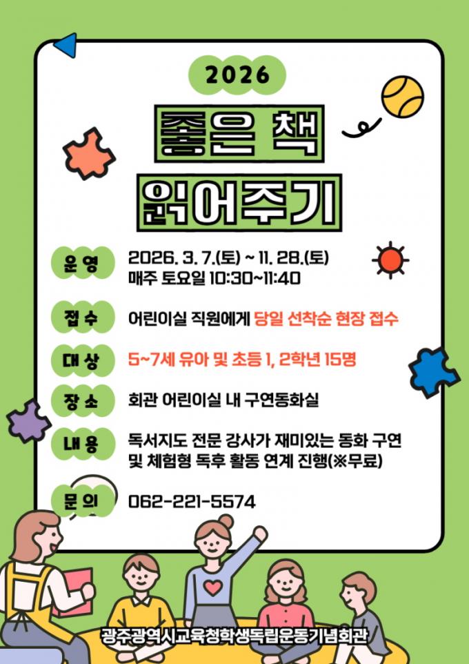 [µ¥Àϸ®Àü³² = ÃÖ¼ö¿¬ ±âÀÚ] ±¤Áֽñ³À°Ã» Çлýµ¶¸³¿îµ¿±â³äȸ°ü(ÀÌÇÏ Çлýµ¶¸³¿îµ¿±â³äȸ°ü)Àº ¿À´Â 3~11¿ù À¯¾Æ ¹× ÃʵîÇб³ ÀúÇгâ ÇлýÀ» ´ë»óÀ¸·Î µ¶¼ ÇÁ·Î±×·¥ ¡®ÁÁÀº Ã¥ ÀоîÁֱ⡯¸¦ ¿î¿µÇÑ´Ù.