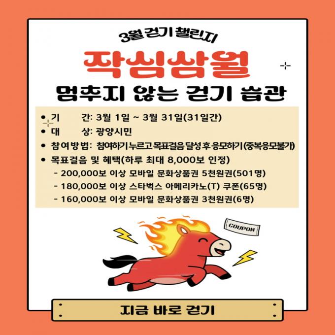 [µ¥Àϸ®Àü³² = ÃÖ¼ö¿¬ ±âÀÚ] ±¤¾ç½Ã´Â ¿À´Â 3¿ù 1ÀϺÎÅÍ 3¿ù 31ÀϱîÁö ÇÑ ´Þ°£ ¸ð¹ÙÀÏ °È±â ¾Û ¿öÅ©¿ÂÀ» Ȱ¿ëÇÑ ¡®À۽ɻï¿ù, ¸ØÃßÁö ¾Ê´Â °È±â ½À°ü! 3¿ù °È±â 縰Áö¡¯¸¦ ¿î¿µÇÑ´Ù°í 24ÀÏ ¹àÇû´Ù.