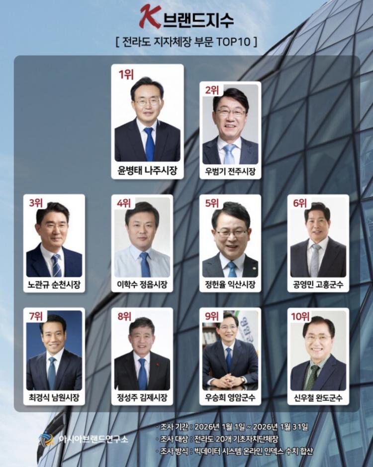 | ¾Æ½Ã¾Æºê·£µå¿¬±¸¼Ò°¡ ¹ßÇ¥ÇÑ ¡®K-ºê·£µåÁö¼ö¡¯ 2026³â 1¿ù Àü¶óµµ ÁöÀÚüÀå ºÎ¹® TOP10. À±º´Å ³ªÁÖ½ÃÀåÀÌ 2³â ¿¬¼Ó 1À§¸¦ Â÷ÁöÇßÀ¸¸ç, ¿ì¹ü±â ÀüÁÖ½ÃÀå, ³ë°ü±Ô ¼øÃµ½ÃÀå µî ÁÖ¿ä ´ÜüÀåµéÀÌ »óÀ§±Ç¿¡ À̸§À» ¿Ã·È´Ù. /»çÁø: ¾Æ½Ã¾Æºê·£µå¿¬±¸¼Ò Á¦°ø |