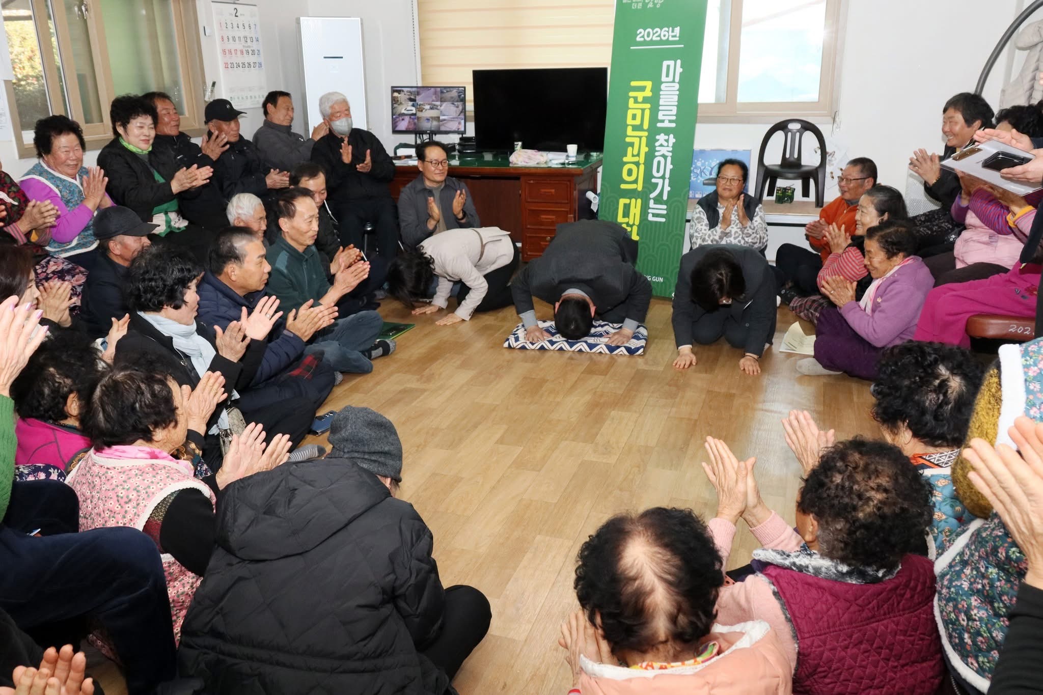 Á¤Ã¶¿ø°¡ ¸¶À»È¸°ü¿¡¼ ÁÖ¹Îµé ¾Õ¿¡ Å«ÀýÀ» ¿Ã¸®¸ç °¨»çÀÇ ¶æÀ» ÀüÇϰí ÀÖ´Ù. 12°³ À¾¡¤¸é 325°³ ¸¶À» ¼øÈ¸ ÀÏÁ¤À» ¸¶¹«¸®ÇÏ´Â ÀÚ¸®¿¡¼ ±º¹Îµé°ú ¹Ú¼ö ¼Ó¿¡ ¼ÒÅëÀÇ ½Ã°£À» À̾´Â ¸ð½À.