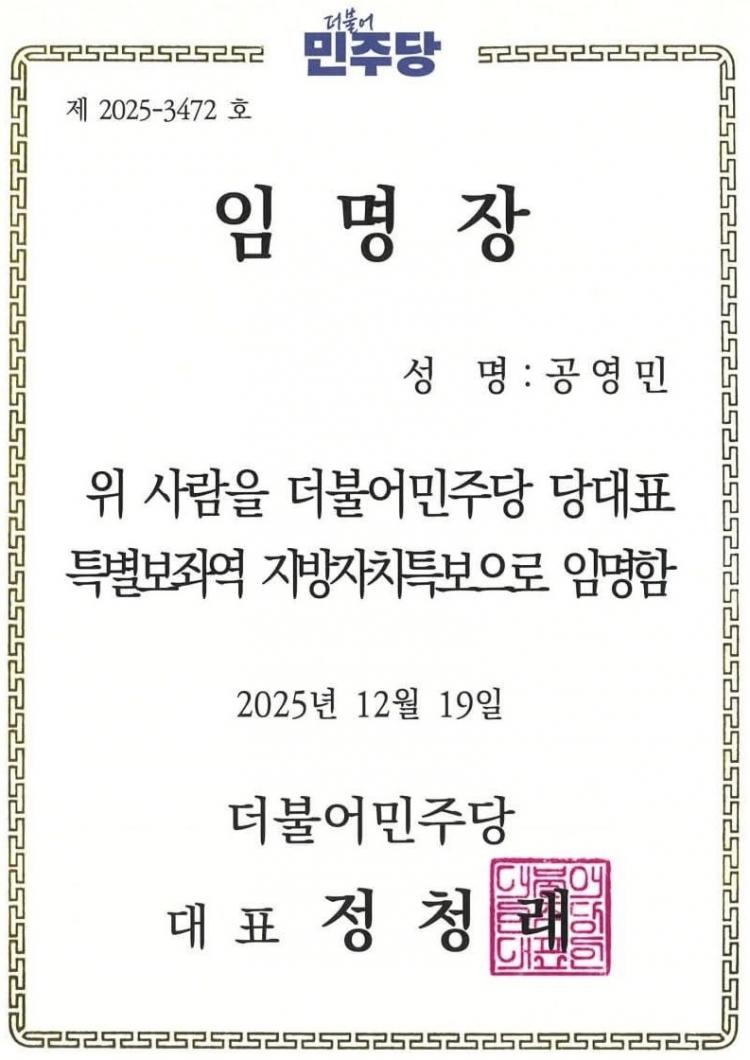 | ´õºÒ¾î¹ÎÁÖ´çÀÌ ¹ß±ÞÇÑ ´ç´ëÇ¥ Ưº°º¸Á¿ª Áö¹æÀÚÄ¡ Ưº¸ ÀÓ¸íÀå. ¼º¸í ¡®°ø¿µ¹Î¡¯, 2025³â 12¿ù 19ÀÏÀÚ ÀÓ¸í ³»¿ë°ú ÇÔ²² Á¤Ã»·¡ ´ç´ëÇ¥ Á÷ÀÎÀÌ ÂïÇô ÀÖ´Ù. |