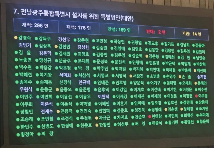 | 1ÀÏ ±¹È¸ º»È¸ÀÇÀå¿¡¼ ¡®Àü³²±¤ÁÖÅëÇÕÆ¯º°½Ã ¼³Ä¡¸¦ À§ÇÑ Æ¯º°¹ý¾È(´ë¾È)¡¯ÀÌ Àç¼® 175ÀÎ Áß Âù¼º 159ÀÎ, ¹Ý´ë 2ÀÎ, ±â±Ç 14ÀÎÀ¸·Î °¡°áµÇ°í ÀÖ´Ù. Àü±¤ÆÇ¿¡ Ç¥°á °á°ú¿Í Âù¼º ÀÇ¿ø ¸í´ÜÀÌ Ç¥½ÃµÇ°í ÀÖ´Ù. /»çÁø:À̰³È£ ÀÇ¿ø ÆäÀ̽ººÏ ĸÃÄ |