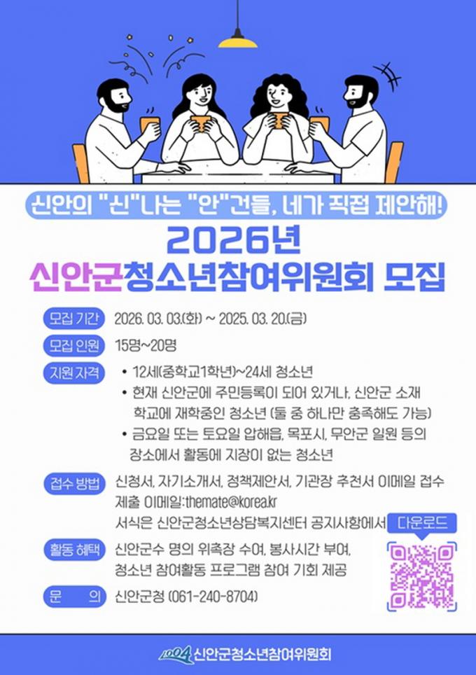 [µ¥Àϸ®Àü³² = ÃÖ¼ö¿¬ ±âÀÚ] ½Å¾È±ºÀÌ Áö¿ª û¼Ò³âµéÀÇ »ý»ýÇÑ ¸ñ¼Ò¸®¸¦ Á¤Ã¥ ÇöÀå¿¡ Á÷Á¢ ´ã¾Æ³»±â À§ÇØ ¡®2026³â ½Å¾È±º û¼Ò³âÂü¿©À§¿øÈ¸¡¯ ½Å±Ô À§¿øÀ» ¸ðÁýÇÑ´Ù.