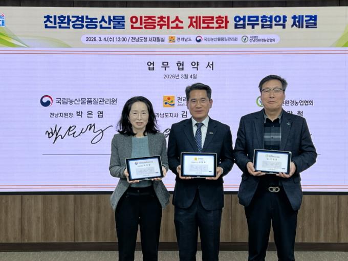 [µ¥Àϸ®Àü³² = ÃÖ¼ö¿¬ ±âÀÚ] Àü¶ó³²µµ´Â 4ÀÏ µµÃ» Á¤¾à¿ë½Ç¿¡¼ ±¹¸³³ó»ê¹°Ç°Áú°ü¸®¿ø Àü³²Áö¿ø, (»ç)Àü³²Ä£È¯°æ³ó¾÷Çùȸ¿Í ÇÔ²² ¡®Ä£È¯°æ³ó»ê¹° ÀÎÁõÃë¼Ò Á¦·ÎÈ¡¯¸¦ À§ÇÑ ¾÷¹«Çù¾àÀ» Çß´Ù.