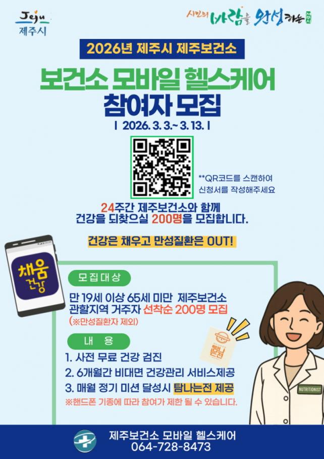 [µ¥Àϸ®Àü³² = ÃÖ¼ö¿¬ ±âÀÚ] Á¦ÁÖº¸°Ç¼Ò´Â Áö¿ªÁÖ¹ÎÀÇ ¸¸¼ºÁúȯ ¿¹¹æ°ú °Ç°»ýȰ ½ÇõÀ» Áö¿øÇϱâ À§ÇØ ¡®2026³â ¸ð¹ÙÀÏ ÇコÄÉ¾î »ç¾÷¡¯ Âü¿©ÀÚ¸¦ 3¿ù 3ÀÏ(È)ºÎÅÍ 3¿ù 13ÀÏ(±Ý)±îÁö ¸ðÁýÇÑ´Ù.