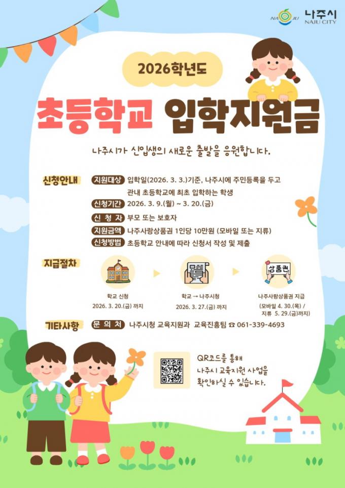 ³ªÁֽô 2026³â ÃʵîÇб³ ÀÔÇÐÀÏÀÎ 3¿ù 3ÀÏ ±âÁØ ³ªÁֽÿ¡ Áֹεî·ÏÀ» µÎ°í °è¼Ó °ÅÁÖÇÏ¸é¼ °ü³» ÃʵîÇб³¿¡ ÃÖÃÊ ÀÔÇÐÇÏ´Â ½ÅÀÔ»ýÀ» ´ë»óÀ¸·Î ÀÔÇÐÁö¿ø±ÝÀ» Áö¿øÇÑ´Ù°í 5ÀÏ ¹àÇû´Ù.