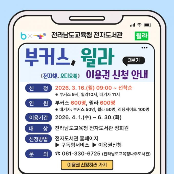 À̹ø ¼ºñ½º´Â Àü¶ó³²µµ±³À°Ã» ÀüÀÚµµ¼°ü Á¤È¸¿øÀ» ´ë»óÀ¸·Î ¿î¿µµÇ¸ç, ÀüÀÚÃ¥ ¼ºñ½º ¡®ºÎÄ¿½º¡¯¿Í ¿Àµð¿ÀºÏ ¼ºñ½º ¡®Àª¶ó¡¯ ÀÌ¿ë±ÇÀ» °¢°¢ 600¸í¾¿ ÃÑ 1,200¸í¿¡°Ô Á¦°øÇÑ´Ù. ÀÌ¿ë±ÇÀ» ¹ÞÀº ÀÌ¿ëÀÚ´Â 2026³â 4¿ùºÎÅÍ 6¿ù±îÁö 3°³¿ù µ¿¾È ´Ù¾çÇÑ ÀüÀÚÃ¥°ú ¿Àµð¿ÀºÏ ÄÜÅÙÃ÷¸¦ ÀÚÀ¯·Ó°Ô ÀÌ¿ëÇÒ ¼ö ÀÖ´Ù.