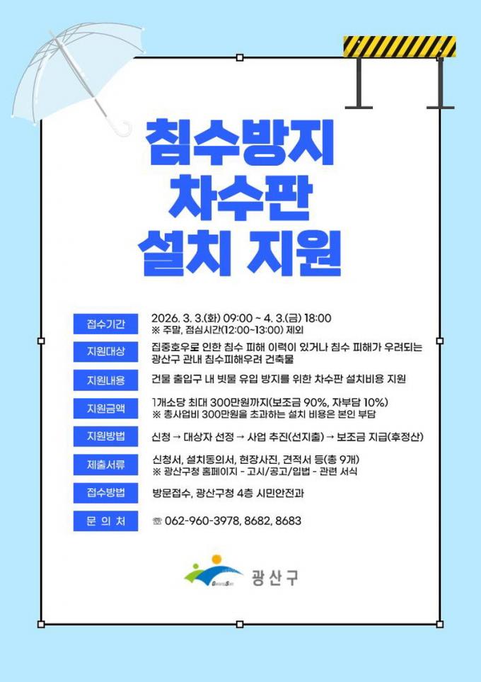 [µ¥Àϸ®Àü³² = ÃÖ¼ö¿¬ ±âÀÚ] ±¤ÁÖ ±¤»ê±¸°¡ ÁýÁßÈ£¿ì·Î ÀÎÇÑ Ä§¼ö ÇÇÇØ ¿¹¹æÀ» À§ÇØ ¡®2026³â ±¤»ê±¸ ħ¼ö¹æÁö Â÷¼öÆÇ ¼³Ä¡ Áö¿ø»ç¾÷¡¯À» ÃßÁøÇÑ´Ù.