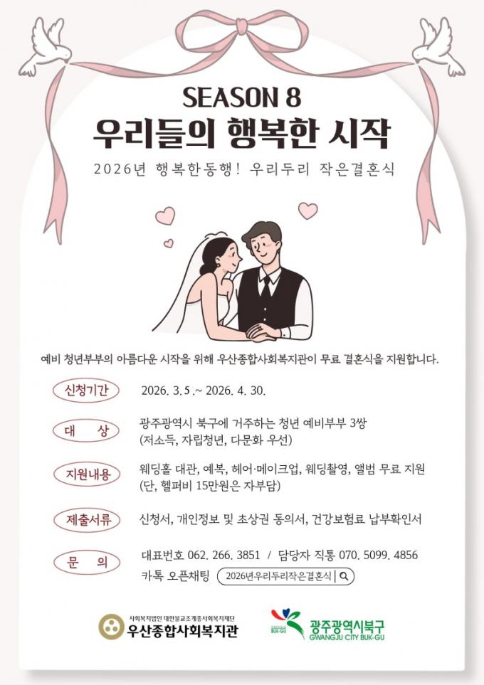 [µ¥Àϸ®Àü³² = ÃÖ¼ö¿¬ ±âÀÚ] ¿ì¸®³ª¶ó °áÈ¥ ¼ºñ½º Æò±Õ ºñ¿ëÀÌ 2,100¸¸ ¿ø¿¡ ´ÞÇÏ´Â °¡¿îµ¥ ±¤ÁÖ±¤¿ª½Ã ºÏ±¸(±¸Ã»Àå ¹®ÀÎ)¿¡¼ û³â ¿¹ºñºÎºÎ¸¦ ´ë»óÀ¸·Î ¹«·á °áÈ¥½ÄÀ» ¿¬´Ù.