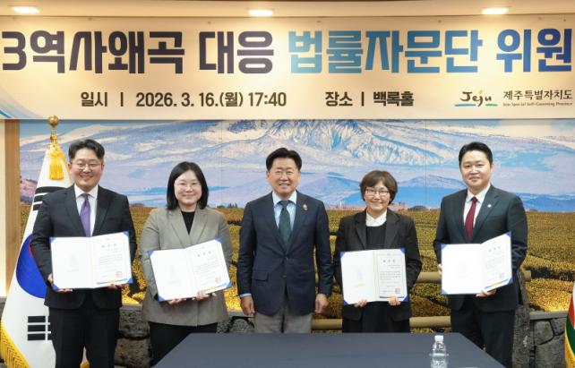 [µ¥Àϸ®Àü³² = ÃÖ¼ö¿¬ ±âÀÚ] Á¦ÁÖÆ¯º°ÀÚÄ¡µµ´Â 16ÀÏ ¿ÀÈÄ 5½Ã 40ºÐ µµÃ» ¹é·ÏȦ¿¡¼ ¡®4¡¤3 ¿ª»ç¿Ö°î ´ëÀÀ ¹ý·üÀÚ¹®´Ü¡¯ À§Ã˽ÄÀ» ¿°í º¯È£»ç 5¸íÀ» À§ÃËÇÑ´Ù.