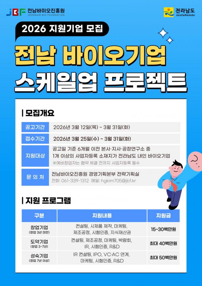 [µ¥Àϸ®Àü³² = ÃÖ¼ö¿¬ ±âÀÚ] Àü¶ó³²µµ°¡ 2026³â ½Å±Ô»ç¾÷À¸·Î ¡®Àü³² ¹ÙÀÌ¿À±â¾÷ ½ºÄÉÀϾ÷ ÇÁ·ÎÁ§Æ®¡¯¸¦ º»°Ý °¡µ¿Çϰí, Âü¿©±â¾÷ ¸ðÁý¿¡ ³ª¼¹´Ù.