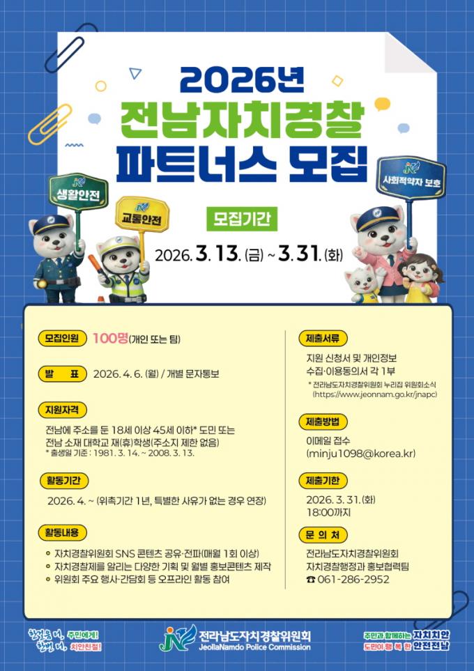 [µ¥Àϸ®Àü³² = ÃÖ¼ö¿¬ ±âÀÚ] Àü¶ó³²µµÀÚÄ¡°æÂûÀ§¿øÈ¸´Â µµ¹Î°úÀÇ ¼ÒÅëÀ» °ÈÇϰí ÇöÀå Á᫐ ÀÚÄ¡°æÂû Ä¡¾È Ȱµ¿À» ÇÔ²²ÇÒ ¡®2026³â Àü³²ÀÚÄ¡°æÂû ÆÄÆ®³Ê½º¡¯¸¦ 31ÀϱîÁö ¸ðÁýÇÑ´Ù°í ¹àÇû´Ù.