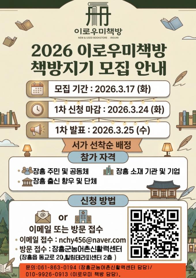 ¸ðÁý ±â°£Àº 3¿ù 17ÀÏ(È)ºÎÅÍ 4¿ù 13ÀÏ(¿ù)±îÁö¸ç, ½Åû ¼ø¼¿¡ µû¶ó ¼°¡°¡ ¹èÁ¤µÇ´Â ¼±Âø¼ø ¹æ½ÄÀÌ´Ù. ½Åû ¾ç½ÄÀº ÀåÈﱺû ȨÆäÀÌÁö °øÁö»çÇ× ¶Ç´Â ÀåÈﱺ³ó¾îÃ̽ÅȰ·Â¼¾ÅÍ È¨ÆäÀÌÁö(http://maeuljh.kr/)¿¡¼ ´Ù¿î·ÎµåÇÒ ¼ö ÀÖ´Ù. ÁֹΠÆíÀǸ¦ À§ÇØ QRÄڵ带 ÅëÇØ °£ÆíÇÏ°Ô ÁøÇàÇÒ ¼ö ÀÖ´Ù.
