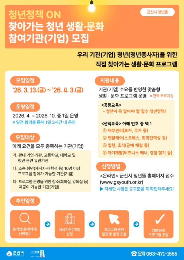 [µ¥Àϸ®Àü³² = ±è¼ºÇö ±âÀÚ] ±º»ê½Ã´Â û³âÀÇ ÀÏ¡¤»ýȰ ±ÕÇüÀ» Áö¿øÇϰí ÇöÀå Áß½ÉÀÇ Á¤Ã¥ ü°¨À» ³ôÀ̱â À§ÇØ ¡®Ã»³âÁ¤Ã¥ ON: ã¾Æ°¡´Â û³â »ýȰ¡¤¹®È¡¯ ÇÁ·Î±×·¥¿¡ Âü¿©ÇÒ ±â°ü(±â¾÷)À» 4¿ù 3ÀϱîÁö ¸ðÁý ÁßÀ̶ó°í ¹àÇû´Ù.