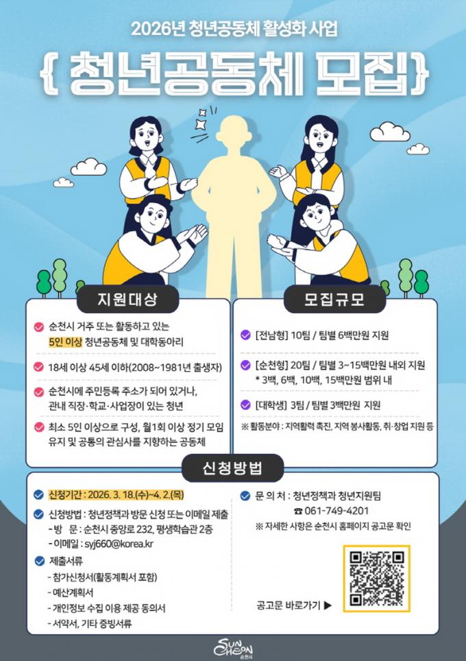 [µ¥Àϸ®Àü³² = ÃÖ¼ö¿¬ ±âÀÚ] ¼øÃµ½Ã´Â û³âµéÀÇ ¾ÆÀ̵ð¾î¿Í ÄÜÅÙÃ÷·Î Áö¿ª ³»¿¡¼ ÆîÄ¡´Â ´Ù¾çÇÑ È°µ¿À» Áö¿øÇÏ´Â 2026³â 「û³â°øµ¿Ã¼ Ȱ¼ºÈ »ç¾÷」ÀÇ Âü¿© °øµ¿Ã¼¸¦ ¸ðÁýÇÑ´Ù°í ¹àÇû´Ù.