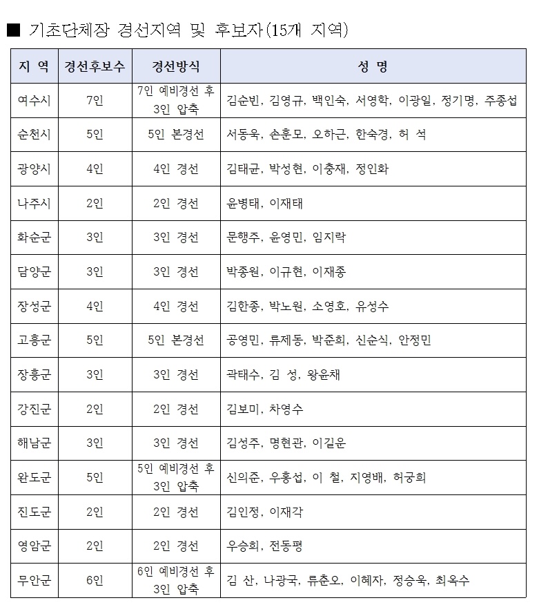 | ´õºÒ¾î¹ÎÁÖ´ç Àü³²µµ´çÀÌ 20ÀÏ ¹ßÇ¥ÇÑ ¡®±âÃÊ´ÜüÀå °æ¼± Èĺ¸ 1Â÷ ¸í´Ü¡¯ ÀÚ·á. 15°³ ½Ã±º¿¡¼ ÃÑ 100¿© ¸íÀÇ È帰¡ À̸§À» ¿Ã¸®¸ç Àü³² Áö¹æ¼±°Å °æ¼± °æÀïÀÌ º»°ÝȵƴÙ. /»çÁø:´õºÒ¾î¹ÎÁÖ´ç Àü³²µµ´ç Á¦°ø |