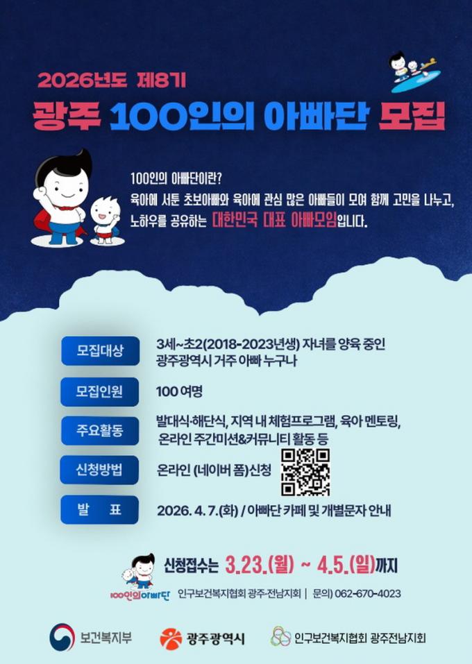 [µ¥Àϸ®Àü³² = ÃÖ¼ö¿¬ ±âÀÚ] ±¤ÁÖ±¤¿ª½Ã¿Í Àα¸º¸°Çº¹ÁöÇùȸ ±¤ÁÖÀü³²Áöȸ´Â ¾ÆºüµéÀÇ À°¾Æ Âü¿©¸¦ Ȱ¼ºÈÇÏ°í °¡Á· Ä£ÈÀû ¾çÀ° ¹®È¸¦ È®»êÇϱâ À§ÇÑ ¡®2026³â Á¦8±â ±¤ÁÖ 100ÀÎÀÇ ¾Æºü´Ü¡¯ Âü¿©ÀÚ¸¦ 23ÀϺÎÅÍ ¼±Âø¼ø ¸ðÁýÇÑ´Ù.
