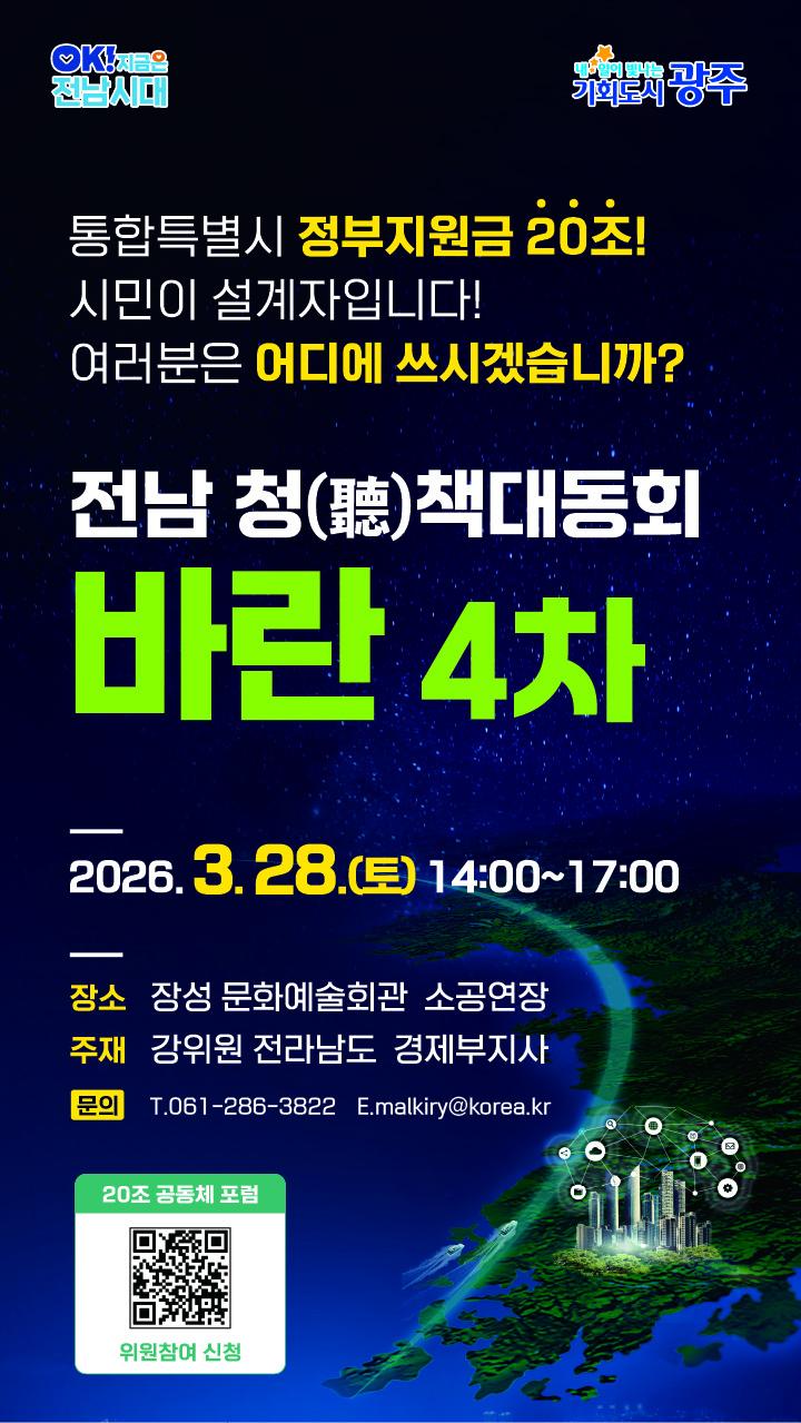 | Àü³²¡¤±¤ÁÖ ÅëÇÕÆ¯º°½Ã Ãâ¹üÀ» ¾ÕµÎ°í Á¤ºÎÁö¿ø±Ý 20Á¶ ¿ø Ȱ¿ë ¹æÇâÀ» ½Ã¹ÎÀÌ Á÷Á¢ ³íÀÇÇÏ´Â ¡®Àü³² û(ôé)Ã¥ ´ëµ¿È¸ ¹Ù¶õ 4Â÷¡¯ °ø½Ä Æ÷½ºÅÍ. 3¿ù 28ÀÏ À强¹®È¿¹¼úȸ°ü¿¡¼ ¿¸®¸ç, ½Ã¹ÎÀÌ ÀçÁ¤ ¼³°è¿¡ Âü¿©Çϴ ù °ø°³ ³íÀÇÀÇ ÀåÀ¸·Î ÁÖ¸ñµÈ´Ù. /»çÁø:Àü³²µµ Á¦°ø |