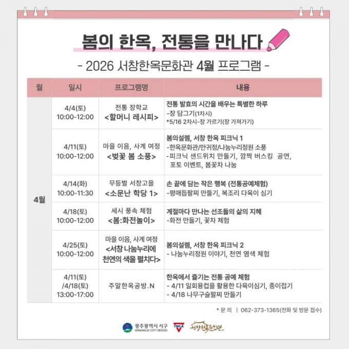 [µ¥Àϸ®Àü³² = ÃÖ¼ö¿¬ ±âÀÚ] ±¤ÁÖ±¤¿ª½Ã ¼±¸(±¸Ã»Àå ±èÀ̰)°¡ µµ½É ¼Ó ÇÑ¿Á¿¡¼ º½ÀÇ Á¤Ãë¿Í ÀüÅ빮ȸ¦ ÇÑÀÚ¸®¿¡¼ Áñ±æ ¼ö Àִ Ưº°ÇÑ °æÇèÀ» ¼±»çÇÑ´Ù. ¼±¸´Â 4¿ù ÇÑ ´Þ°£ ¼Ã¢ÇÑ¿Á¹®È°ü¿¡¼ ¡®º½ÀÇ ÇÑ¿Á, ÀüÅëÀ» ¸¸³ª´Ù¡¯¸¦ ÁÖÁ¦·Î ÀüÅë¹®È ÇÁ·Î±×·¥À» ¿î¿µÇÑ´Ù.