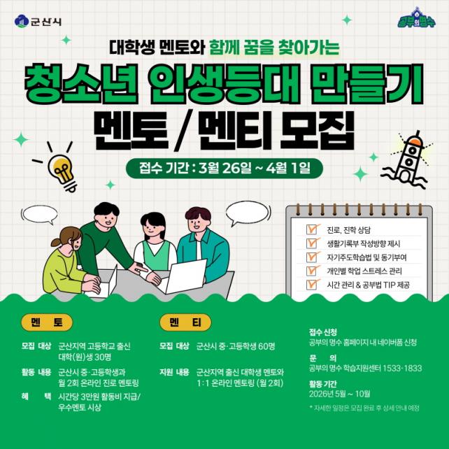 [µ¥Àϸ®Àü³² = ±è¼ºÇö ±âÀÚ] ±º»ê½Ã´Â °ü³» Áß¡¤°íµîÇлýÀÇ Áø·Î Ž»ö°ú ÇнÀ ¿ª·® °È¸¦ Áö¿øÇϱâ À§ÇØ Áö¿ª Ãâ½Å ´ëÇлýÀÌ Âü¿©ÇÏ´Â ¡®Ã»¼Ò³â Àλýµî´ë ¸¸µé±â¡¯ »ç¾÷À» ÃßÁøÇϰí, ¸àÅä¿Í ¸àƼ¸¦ ¸ðÁýÇÑ´Ù°í ¹àÇû´Ù.