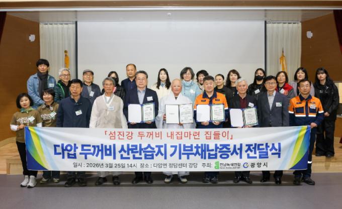 À̹ø Çà»ç´Â ½Ã¹Î°ú ȯ°æ´Üü, ±â¾÷ÀÌ ÇÔ²² º¸ÀüÇÑ µÎ²¨ºñ »ê¶õ½ÀÁö 230Æò(¾à 750§³)À» ±¤¾ç½Ã¿¡ ±âºÎä³³ÇÑ °ÍÀ» ±â³äÇϱâ À§ÇØ ¸¶·ÃµÆ´Ù. Çà»ç¿¡´Â ±¤¾ç½Ã, Àü³²³ì»ö¿¬ÇÕ, Æ÷½ºÄÚ ±¤¾çÁ¦Ã¶¼Ò, ½Ã¹Î ±âºÎÀÚ µî 30¿© ¸íÀÌ Âü¼®ÇØ °æ°úº¸°í, Ãà»ç, ±âºÎä³³ Áõ¼ ¹× °¨»çÀå Àü´Þ, ±â³ä¼® Á¦¸·, ¼½ÄÁö Ž¹æ µîÀ» ÇÔ²²Çß´Ù.