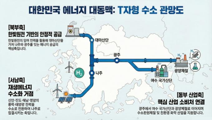 ¼ö¼Ò ÀÎÇÁ¶ó´Â Àü³²¡¤±¤ÁÖ¸¦ Áß½ÉÀ¸·Î ÇÑ TÀÚÇü ÆÄÀÌÇÁ¶óÀÎÀ¸·Î ±¸ÃàµÈ´Ù. ºÏºÎÃàÀº ÇѺû¿øÀü¿¡¼ ³ªÁÖ¡¤±¤ÁÖ·Î À̾îÁö´Â ¾ÈÁ¤Àû °ø±ÞÃà, ¼³²ÃàÀº ½Å¾È¡¤Çس²¡¤¿µ¾Ï¡¤Áøµµ µî Àç»ý¿¡³ÊÁö °ÅÁ¡À» ¿¬°áÇÏ´Â Áý°áÃà, µ¿ºÎÃàÀº ±¤ÁÖ¿¡¼ ¿©¼ö»ê´Ü°ú ±¤¾çÁ¦Ã¶·Î À̾îÁö´Â »ê¾÷ Ȱ¿ëÃàÀ¸·Î ±¸¼ºµÈ´Ù.