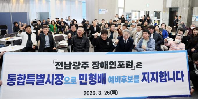 [µ¥Àϸ®Àü³² = ÃÖ¼ö¿¬ ±âÀÚ] Àü³²¡¤±¤ÁÖÁö¿ª Àå¾ÖÀΠüÀ°Àεé·Î ±¸¼ºµÈ Àå¾ÖÀÎüÀ°Æ÷·³°ú ±¤ÁÖÀü³²Ã¼À°ÁøÈïȸ ¼Ò¼Ó ¼±¼ö´Ü µî Àϵ¿ 248ÀÎÀÌ ´õºÒ¾î¹ÎÁÖ´ç Àü³²±¤ÁÖÅëÇÕÆ¯º°½ÃÀå °æ¼±Èĺ¸ÀÎ ¹ÎÇü¹è ±¹È¸ÀÇ¿ø(±¤ÁÖ ±¤»ê±¸À»)¿¡ ´ëÇÑ ÁöÁö¸¦ °ø½Ä ¼±¾ðÇß´Ù.