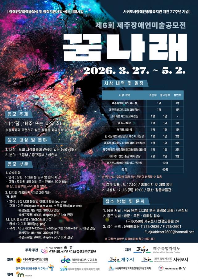 ÀÚ¼¼ÇÑ »çÇ×Àº º¹Áö°ü ȨÆäÀÌÁö(www.seogwicrc.or.kr) ¡®Á¦6ȸ Á¦ÁÖÀå¾ÖÀι̼ú°ø¸ðÀü – ²Þ³ª·¡ ÀÀ¸ð Á¢¼ö ¾È³»¡¯ °ø°í¸¦ Âü°í ¹Ù¶ó¸ç, ¹®ÀÇ »çÇ×Àº ¹®È¿¹¼úÆÀ(¢Ï735-2626)À¸·Î ¿¬¶ôÇÏ¸é µÈ´Ù.