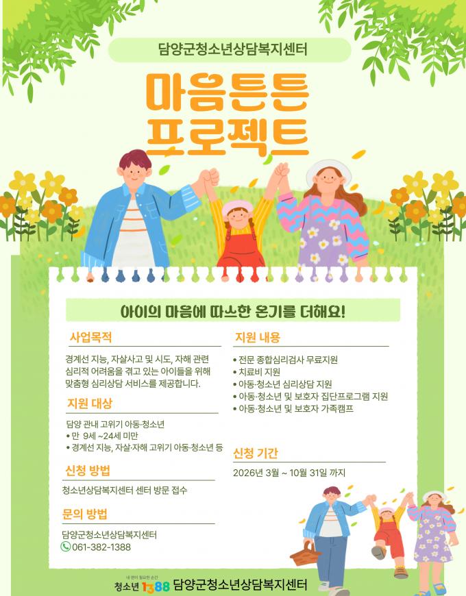 [µ¥Àϸ®Àü³² = ÃÖ¼ö¿¬ ±âÀÚ] ´ã¾ç±ºÃ»¼Ò³â»ó´ãº¹Áö¼¾ÅÍ(¼¾ÅÍÀå ¼ÕÀº¾Æ)´Â Á¤¼Àû À§±â¸¦ °Þ´Â Áö¿ª ³» ¾Æµ¿¡¤Ã»¼Ò³âÀÇ ½É¸® ȸº¹°ú °Ç°ÇÑ ¼ºÀåÀ» µ½°íÀÚ ¿À´Â 10¿ù±îÁö ¡®¸¶À½Æ°Æ° ÇÁ·ÎÁ§Æ®¡¯À» ÃßÁøÇÑ´Ù.