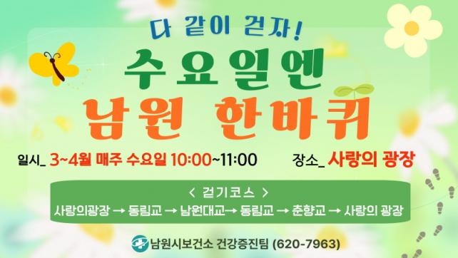 [µ¥Àϸ®Àü³² = ±è¼ºÇö ±âÀÚ] ³²¿ø½Ãº¸°Ç¼Ò(¼ÒÀå ÇÑ¿ëÀç)°¡ ½Ã¹ÎÀÇ °Ç° ÁõÁø°ú ÀÏ»ó ¼Ó ¿îµ¿ ½À°ü Çü¼ºÀ» À§ÇØ ¿À´Â 4¿ùºÎÅÍ 11¿ù±îÁö °È±â ½Çõ ÇÁ·Î±×·¥ÀÎ ¡®¼ö¿äÀÏ¿£ ³²¿ø ÇѹÙÄû¡¯¸¦ ¿î¿µÇÑ´Ù.