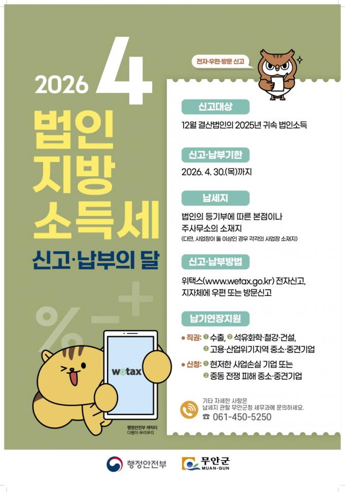 [µ¥Àϸ®Àü³² = ÃÖ¼ö¿¬ ±âÀÚ] ¹«¾È±ºÀº ¹ýÀÎ ¼Òµæ¿¡ ´ëÇØ Áö¹æÀÚÄ¡´Üü¿¡ ³³ºÎÇÏ´Â ¹ýÀÎÁö¹æ¼Òµæ¼¼ ½Å°í¡¤³³ºÎ ±â°£À» ¸Â¾Æ ¿À´Â 4¿ù 30ÀϱîÁö ÁýÁ߽Űí±â°£À» ¿î¿µÇÑ´Ù°í ¹àÇû´Ù.