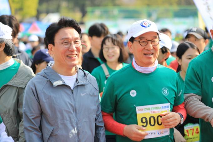 ½ÅÁ¤ÈÆ È帰¡ ¡®5¡¤18 Ä·ÆÛ½º ¸¶¶óÅæ ´ëȸ¡¯¿¡ ¾Õ¼ ±è¹Î¼® ±¹¹«ÃѸ®¿Í ÇÔ²² Ãâ¹ß¿¡ ¾Õ¼°í ÀÖ´Ù. µÎ »ç¶÷Àº 1980³â´ë ¹ÎÁÖȿÀ» ÇÔ²²ÇÑ Àο¬À» À̾î À̳¯ ³ª¶õÈ÷ ¸¶¶óÅæ¿¡ Âü¿©Çß´Ù.