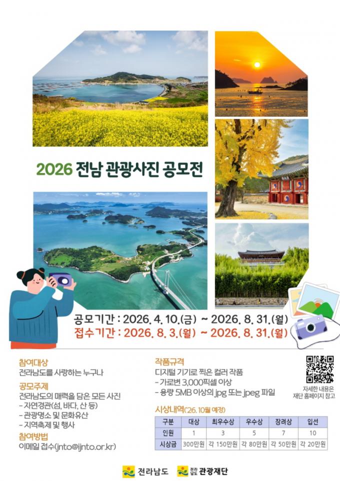 [µ¥Àϸ®Àü³² = ÃÖ¼ö¿¬ ±âÀÚ] Àü¶ó³²µµ´Â ÀÚ¿¬°æ°ü°ú °ü±¤Áö, ÃàÁ¦ µî Áö¿ªÀÇ ´Ù¾çÇÑ ¸Å·ÂÀ» ³Î¸® ¾Ë¸®°í ¼öÁØ ³ôÀº »çÁø ÄÜÅÙÃ÷¸¦ ¹ß±¼Çϱâ À§ÇØ ¡®2026³â Àü³² °ü±¤»çÁø °ø¸ðÀü¡¯À» ÃßÁøÇÑ´Ù.