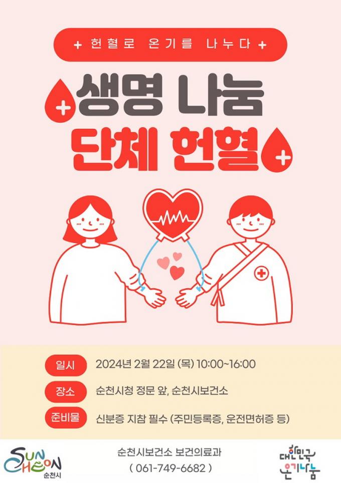 [µ¥Àϸ®Àü³² = ÃÖ¿µ¹Î ±âÀÚ] ¼øÃµ½Ã(¼øÃµ½ÃÀå ³ë°ü±Ô)´Â µ¿Àý±â Ç÷¾× È®º¸¸¦ À§ÇÏ¿© ¿À´Â 22ÀÏ 10½ÃºÎÅÍ 16½Ã±îÁö ¼øÃµ½Ãû°ú º¸°Ç¼Ò ¾Õ¿¡¼ ´ëÇÑÀû½ÊÀÚ»ç ±¤ÁÖÀü³²Ç÷¾×¿ø°ú ÇÔ²² ´Üü ÇåÇ÷À» ½Ç½ÃÇÑ´Ù°í ¹àÇû´Ù.