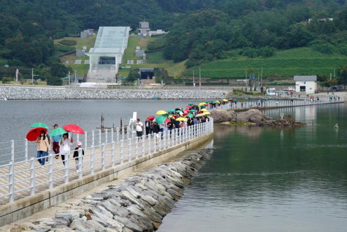 ½Ã¹Î°ú °ü±¤°´µéÀÌ ¿©¼ö½Ã°¡ Á¦°øÇÑ ¿ì»êÀ» ¾²°í ÀåµµÀÇ Áø¼¶´Ù¸®¸¦ °Ç³Ê°í ÀÖ´Ù.