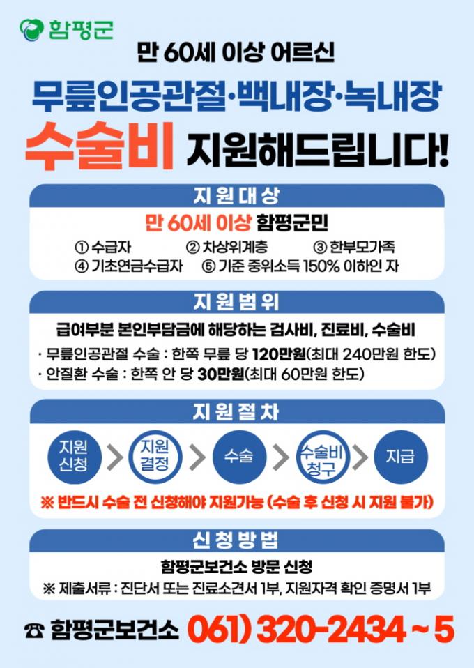 ¹«¸Àΰø°üÀýÀº ¹«¸´ç 120¸¸¿ø¾¿ ÃÖ´ë 240¸¸¿ø±îÁö, ¹é³»À塤³ì³»Àå°ú °°Àº ¾ÈÁúȯ ¼ö¼úÀº 1¾È(äÑ)´ç 30¸¸¿ø¾¿ ÃÖ´ë 60¸¸¿ø±îÁö Áö¿øµÈ´Ù. ½ÅûÀº ¹Ýµå½Ã ¼ö¼úÀ» ¹Þ±â Àü¿¡ ÇØ¾ß Çϸç, Áø´Ü¼(¶Ç´Â ¼Ò°ß¼)¿Í ÀÚ°Ý Áõ¸í¼·ù¸¦ ÁöÂüÇØ ÇÔÆò±º º¸°Ç¼Ò·Î ¹æ¹®ÇÏ¸é µÈ´Ù.